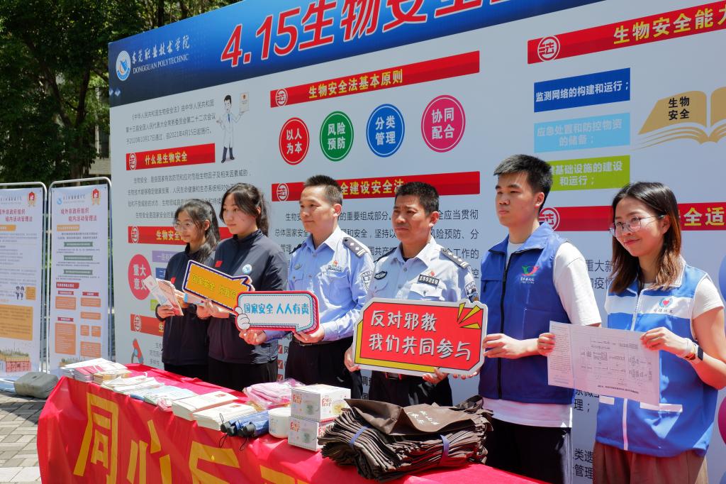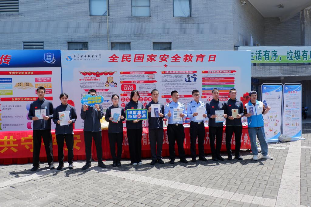 在第十个全民国家安全教育日来临之际,为深入贯彻落实总体国家安全观,增强全民国家安全意识,4月15日上午,我校联合松山湖管委会相关部门、松山湖公安分局在滋兰餐厅前空地共同举办“全民国家安全教育 走深走实十周年”主题宣传教育活动。学校党委委员、副校长杨云奇,学校保卫处全体人员和师生代表参加活动。